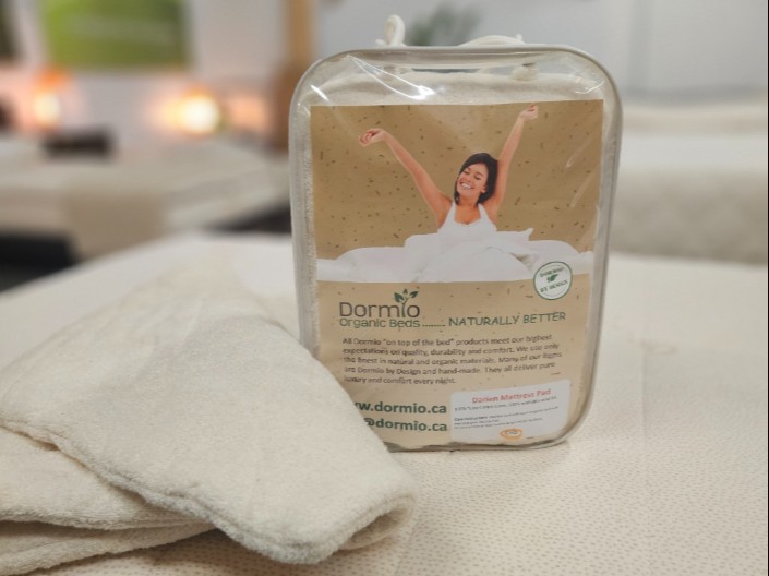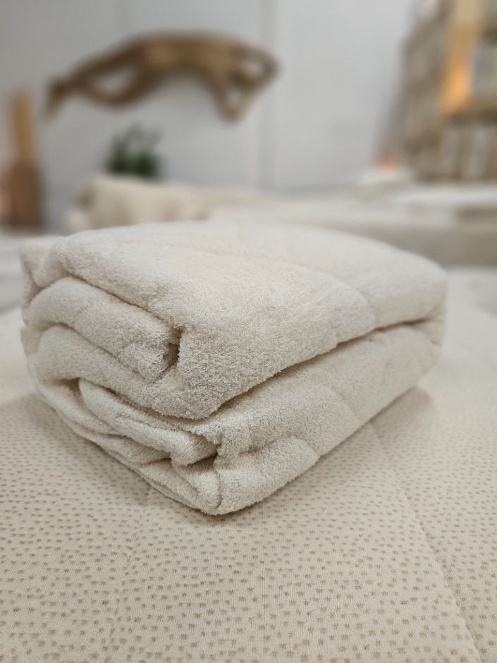 Made with 100% Cotton Terry on the outside, and filled with New Zealand washable Wool. This Cotton Terry is also used as the skirt that goes all around the sides of the pad, to fit completely over your mattress. It has full elastic all around the bottom edge for the best fit. They are extremely moisture-absorbent, and they are also very soft to sleep on.